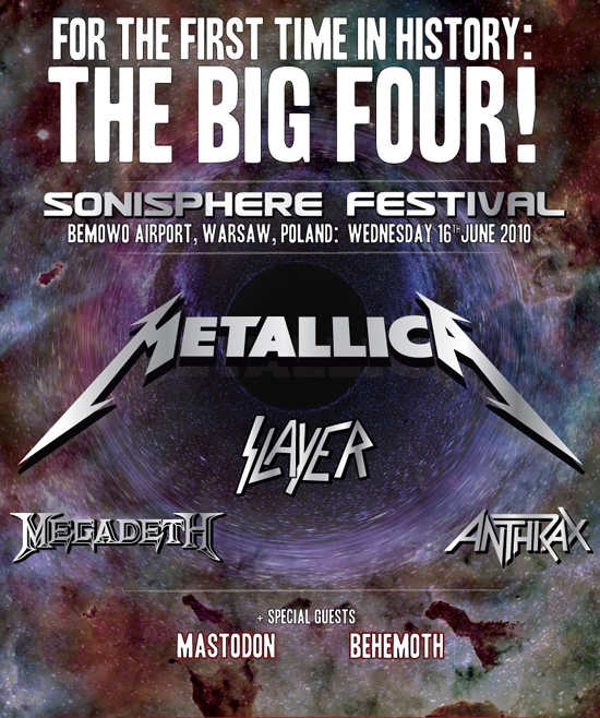 Estamos ligados que o Metallica vai fazer 3 shows no Brasil em janeiro, mas esta notícia aqui, que descobri no MusicRadar, é mais ou menos como uma semifinal de campeonato com os quatro grandes de São Paulo. Ou os quatro grandes do Rio. Metallica, Slayer, Megadeth e Anthrax, juntos. Os “quatro grandes” do thrash metal vão tocar pela primeira vez num mesmo festival. De quebra, Mastodon e Behemoth. O Sonisphere, em 16 de junho de 2010, em Varsóvia, na Polônia; 18 de junho, em Zurich, e em 19 de junho, em Praga, na República Tcheca. Site do Metallica confirma e diz que mais datas com o “Big Four” do thrash reunido podem pintar. No começo dos anos 90, Slayer, Megadeth e Anthrax chegaram a excursionar juntos, às vezes com Testament à tiracolo. Clash of the Titans era o nome da turnê.