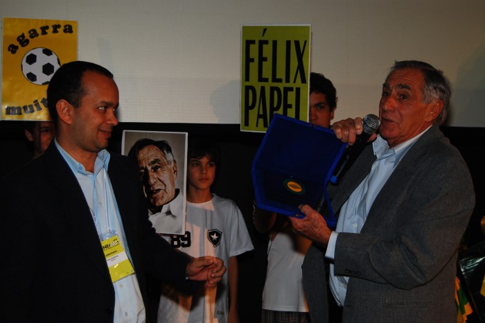 O goleiro da seleção tricampeão no México, em 70, Félix, é o boleiro homenageado da 1ª edição do CineFoot, Festival de Cinema de Futebol, que vai até amanhã, no Rio – depois, a mostra embarca para São Paulo (Museu do Futebol, 4 de junho). No sábado, antes da sessão dos filmes “Um Artilheiro no Meu Coração” e “Telê Santana: Meio Século de Futebol-Arte“, Félix recebeu a homenagem “Gol de Placa” da organização do festival, das mãos do jornalista Paulo Guilherme, autor do livro “Goleiros: Heróis e Anti-Heróis da Camisa 1” (e também de “Os 11 Maiores Laterais do Futebol Brasileiro“). Figuraça, o Félix. Ele brincou com o gol que tomou do Uruguai, mas lembrou de uma grande defesa em seguida nesse jogo, e de outra defesaça, contra a Inglaterra. Quem também receberá uma placa do CineFoot é o cineasta Maurice Capovilla, diretor de “Subterrâneos do Futebol”, cartaz de uma sessão especial nesta terça-feira, último dia do festival no Rio, às 19h, no Unibanco Arteplex. Bacana!