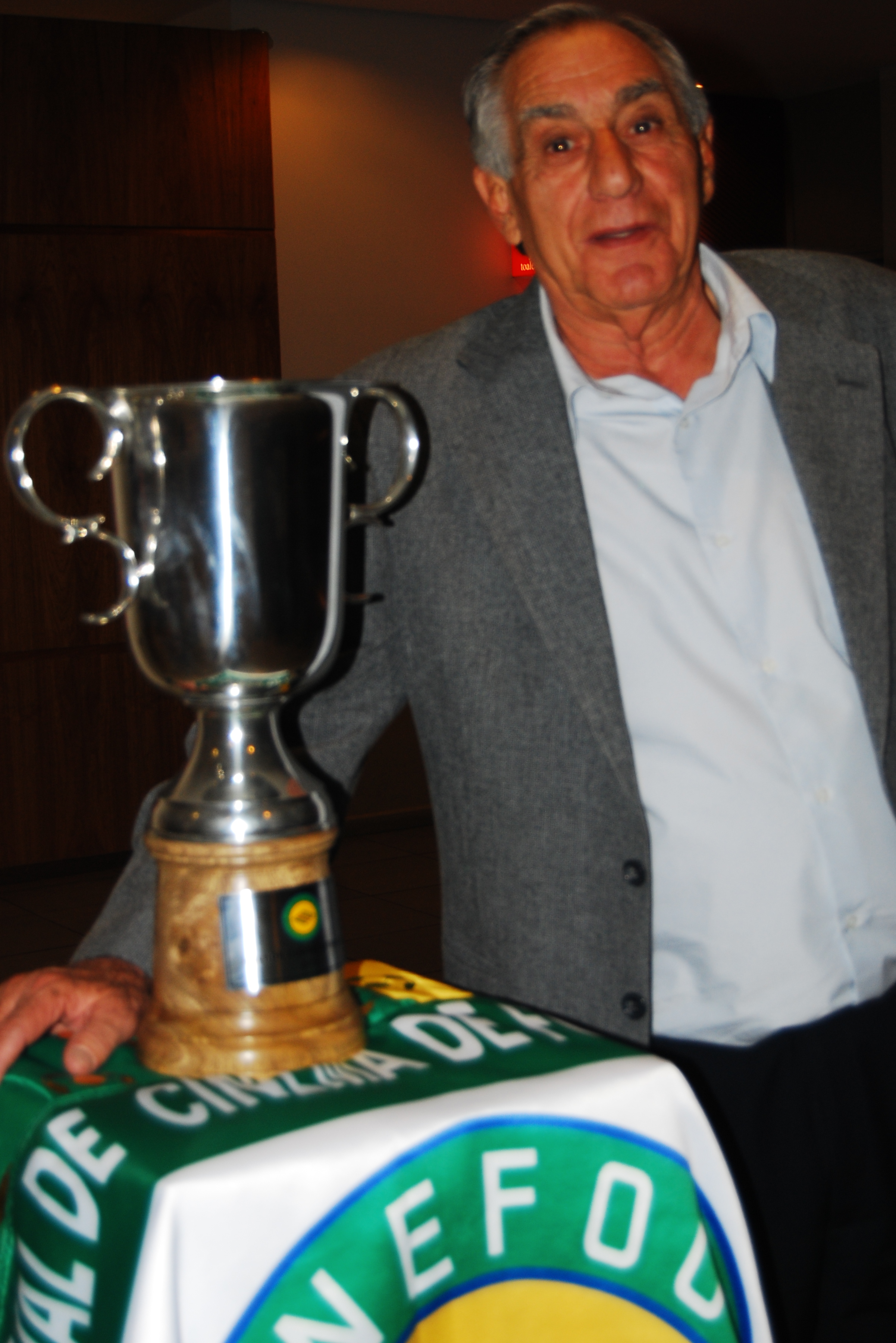 Félix "Papel", apelido lembrado no cartaz ali atrás, recebe a placa do jornalista Paulo Guilherme. FOTO Manu Justo/CineFootFélix, o goleiro do tri, e a taça CineFoot, que será entregue ao melhor filme. FOTO Manu Justo/CineFoot