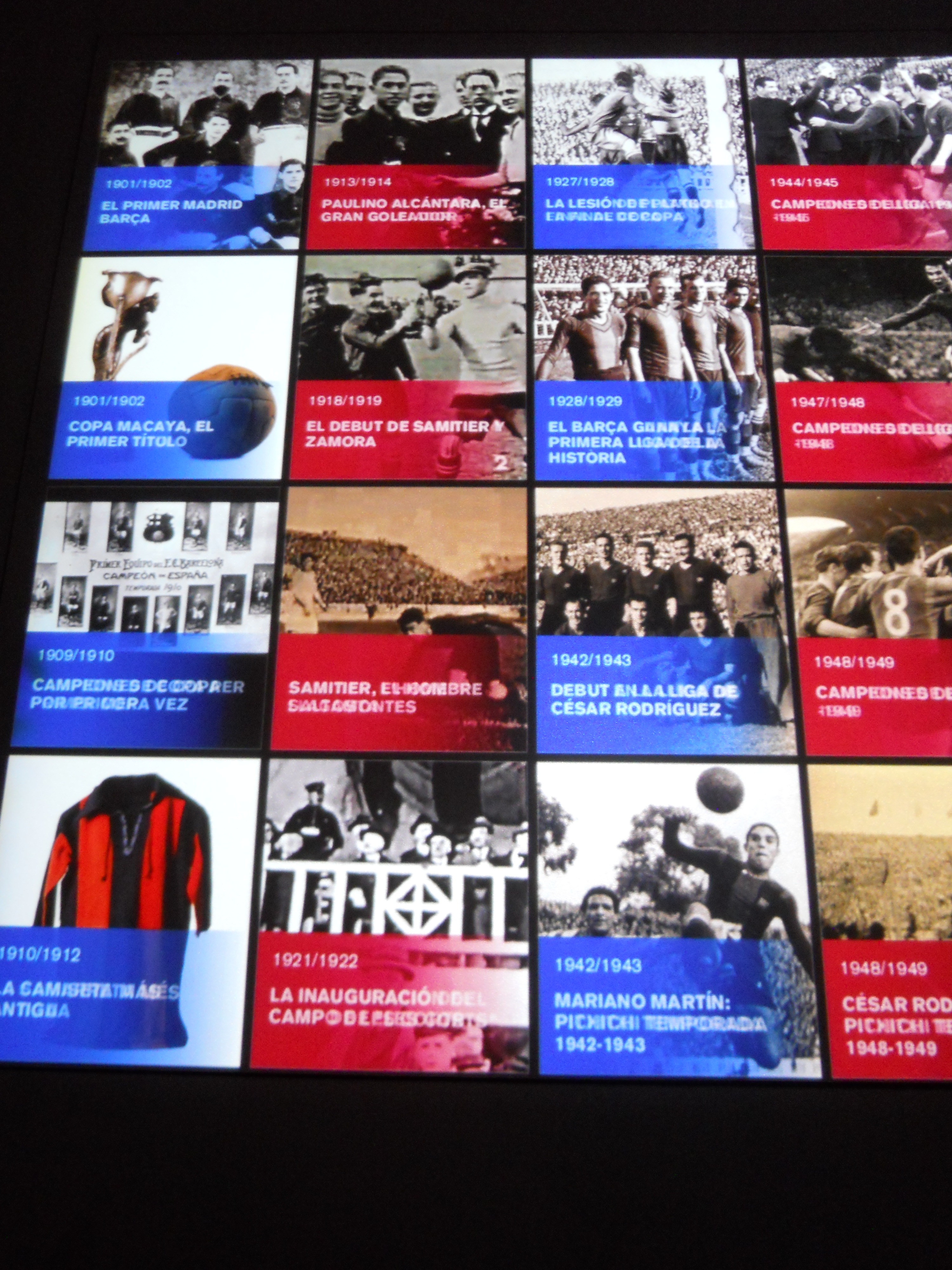 Agora, o que chama a atenção mesmo na turnê pelo Camp Nou e Museu do Barça é a nova seção interativa. Uma mesa cheia de telas touchscreen permite ao visitante saber mais sobre 200 (duzentos!) capítulos importantes da história “blaugrana”, como o primeiro clássico Barça-Real Madrid, o primeiro título, os primeiros ídolos, as mais antigas “samarretas” (camisetas, em catalão)…