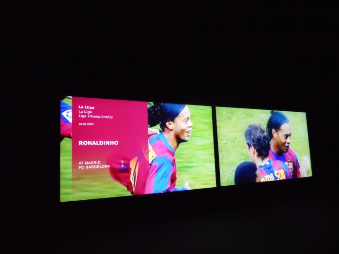 Ainda no espaço multimídia do Museu del FC Barcelona, telas mostram os gols mais bonitos. Estão lá obras primas de Maradona, Messi, Ronaldinho Gaúcho e o golaço de bicicleta de Rivaldo, no jogo que levou o Barça de volta à Champions, em 2001. Rivaldo 3, Valencia 2. E que chato, amigos, eu estava lá… atrás do gol, lá em cima, no nível mais alto do Camp Nou, mas estava lá nesta partida história de Rivaldo Maravilha. Ainda uma parede de múltiplas telas que projetam um filme de 35 mm sobre a Champions de 2008/2009 (a jogadaça do Eto´o na final de Roma contra o ManUtd é vista de vários ângulos, simultaneamente – há uma tela parecida no Museu da Língua Portuguesa, em São Paulo). Sensacional.