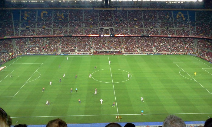 O estádio – desenhado pelos arquitetos Francesc Mitjans Miró e Josep Soteras Mauri, com colaboração de Lorenzo García – para substituir o velho campo de Les Corts, erguido em 1922 e sucessivamente ampliado, mas que ficou pequeno na era Kubala. O novo campo começou a ser construído em 1954 e ficou pronto em 1957. Foi inaugurado em 24 de setembro de 1957, num amistoso entre o Barça e uma seleção de jogadores de Varsóvia. Os donos da casa ganharam por 4 a 2 e o brasileiro Evaristo de Macedo fez um dos gols. A arena era oficialmente chamada de Estadi del FC Barcelona até a temporada 2000/2001 – quando, enfim, o nome mais querido pela torcida foi oficializado. É Camp Nou e pronto, ponto.