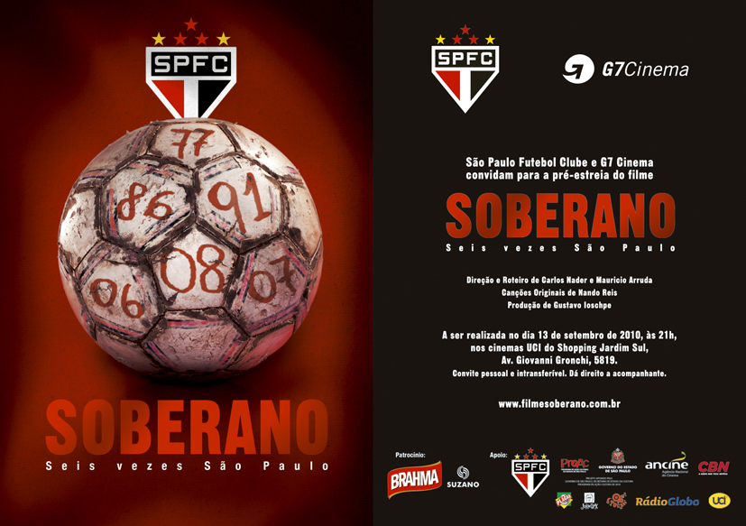 O público do cinema UCI Jardim Sul mais parecia uma torcida, com uniformes e até bandeiras. O hall foi decorado com cartazes gigantes de 6 escretes campeões brasileiros. A pré-estreia da noite contou com a presença de parte do elenco da película. Raí, Sidney, Jorge Wagner, Alex Silva, Rogério Ceni. O músico Nando Reis, que compôs músicas para o filme, também apareceu – todo feliz. Era noite de lançamento de Soberano – Seis Vezes São Paulo, documentário sobre os títulos brasileiros do tricolor (77/86/91/06/07/08) produzido pela G7 Cinema, com direção de Carlos Nader e Maurício Arruda. Estreou em 17 de setembro de 2010, em cinemas de 10 estados. E esta semana ganha mais uma exibição em tela grande na seleção paulista do CineFoot, no Museu do Futebol.