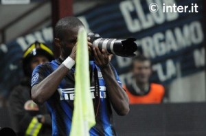 E ainda curtiu uma de fotógrafo na comemoração do quarto gol! Engraçada foi a cara do dono da câmera, na transmissão de TV! 4×0 (veja) no Giuseppe Meazza/San Siro. O camaronês já é o artilheiro da Champions: 4 tentos.