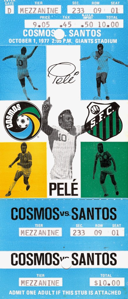 O amistoso de despedida do Rei do soocer é um dos assuntos abordados na autobiografia muito bem ilustrada Pelé – Minha Vida em Imagens, lançada pela editora Cosac Naify. Além do texto de Pelé, muitas fotos e lista dos 1.283 gols, o livraço vem com encartes, como o ingresso (veja ao lado) desse jogo entre Cosmos e Santos. O Peixe contava com Clodoaldo, Aílton Lira, Juary e João Paulo, mix de veteranos e jovens de uma das muitas gerações do que se convencionou chamar Meninos da Vila. O time da Warner Communications contava ainda com Beckenbauer, Carlos Alberto Torres e Chinaglia – atacante italiano que não se dava exatamente bem com o Rei, aprendi no documentário O Mundo A Seus Pés – A Extraordinária História do NewYork Cosmos. Hoje o Museu do Futebol tem uma tarde reservada a filmes sobre Pelé. A partir de 15h, os curtas Uma História de Futebol, bela ficção sobre a infância do Rei, mais Pelé 70 e 1.284 – O Último Gol de Pelé, que circula na web. Às 16h30, o doc Isto É Pelé. Leia mais sobre o filme do Cosmos neste link, ou dentro do post.