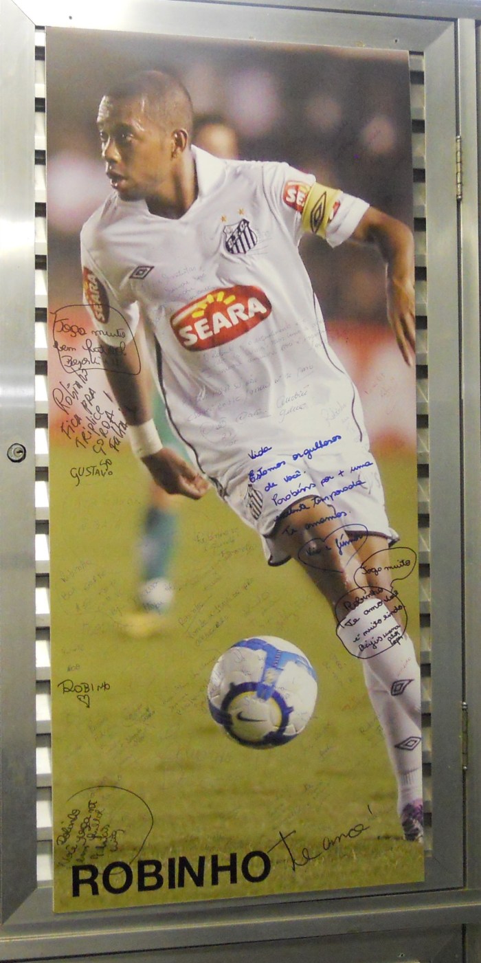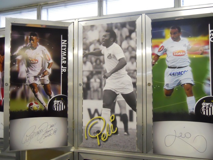 No vestiário, uma das maiores curiosidades da visita. O armário de Pelé, fechado desde que ELE se despediu do Santos. Diz a lenda que há algum objeto lá. Mas isso só será conferido depois que Pelé reinar em outra dimensão.
