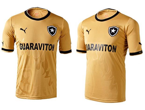 Belíssima camisa dourada do Botafogo. Faz parte da campanha “Tenho estrela, sou Fogo de coração”. O lançamento será na quarta-feira, quando a fornecedora (Puma) vai começar uma ação de marketing da loja de General Severiano. Numa cabine acústica, o torcedor do Fogão será incentivado a vestir a camisa e demonstrar sua paixão pelo Glorioso, enquanto vê gols e outras imagens históricas. Os batimentos cardíacos do torcedor serão medidos e os mais acelerados vão para um ranking.