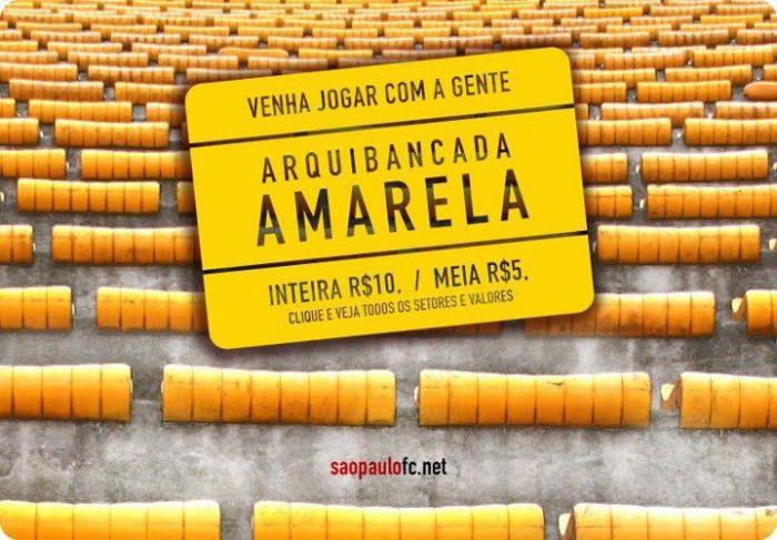 Promoções como a que o São Paulo faz na arquibancada amarela, neste Brasileirão, são uma saída pra aumentar o público nos estádios. Deveriam ser estendidas a outros setores que costumam ficar vazios. IMAGEM http://www.saopaulofc.net