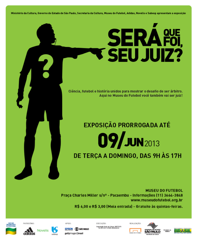 Apita o árbitro! A exposição “Será que Foi, Se Juiz” vai ter prorrogação, no Museu do Futebol. Em todos os sábados de maio de 2013, a visitação é grátis. Na Virada Cultural, no sábado 18 de maio, o Museu fica aberto até 20h.