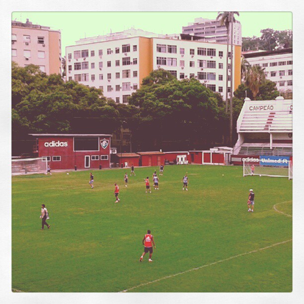 Panorama do estádio Manoel Schwartz, mais conhecido pelo nome do bairro, Laranjeiras, onde a seleção brasileira fez seu primeiro jogo, em 1914, e também levantou a primeira de muitas taças, o Sul-Americano de 1919. Nele, o Fluminense fez o seu último treino antes da partida desta tarde em Presidente Prudente, que pode ser decisiva. Breve, aqui no Fut Pop Clube, o rolê do blog pela Sala de Troféus do tricolor.