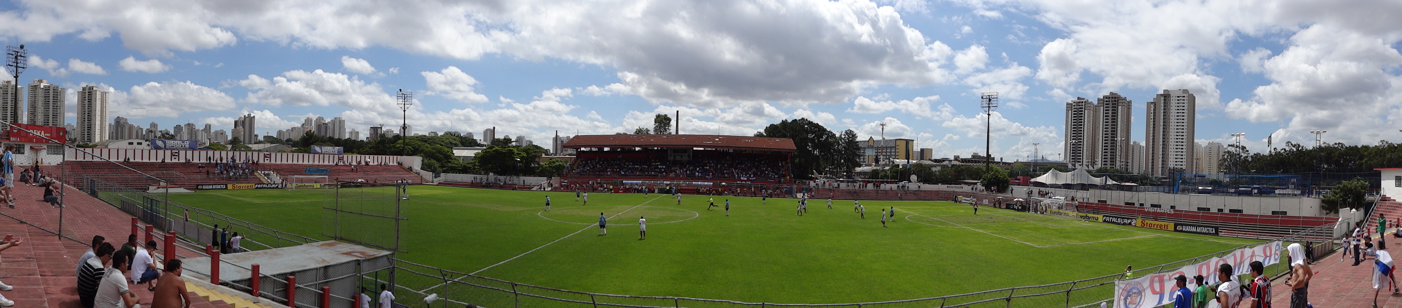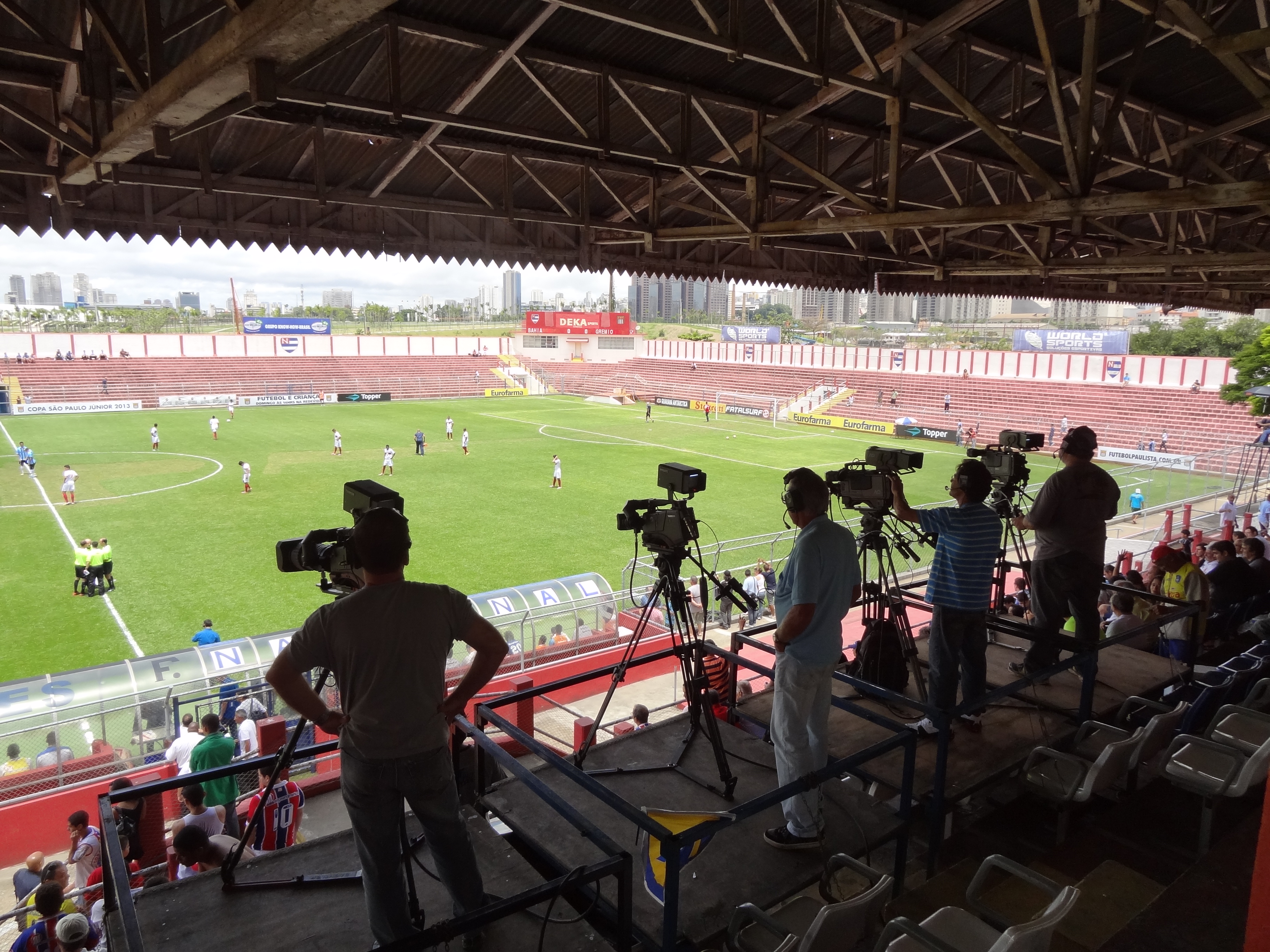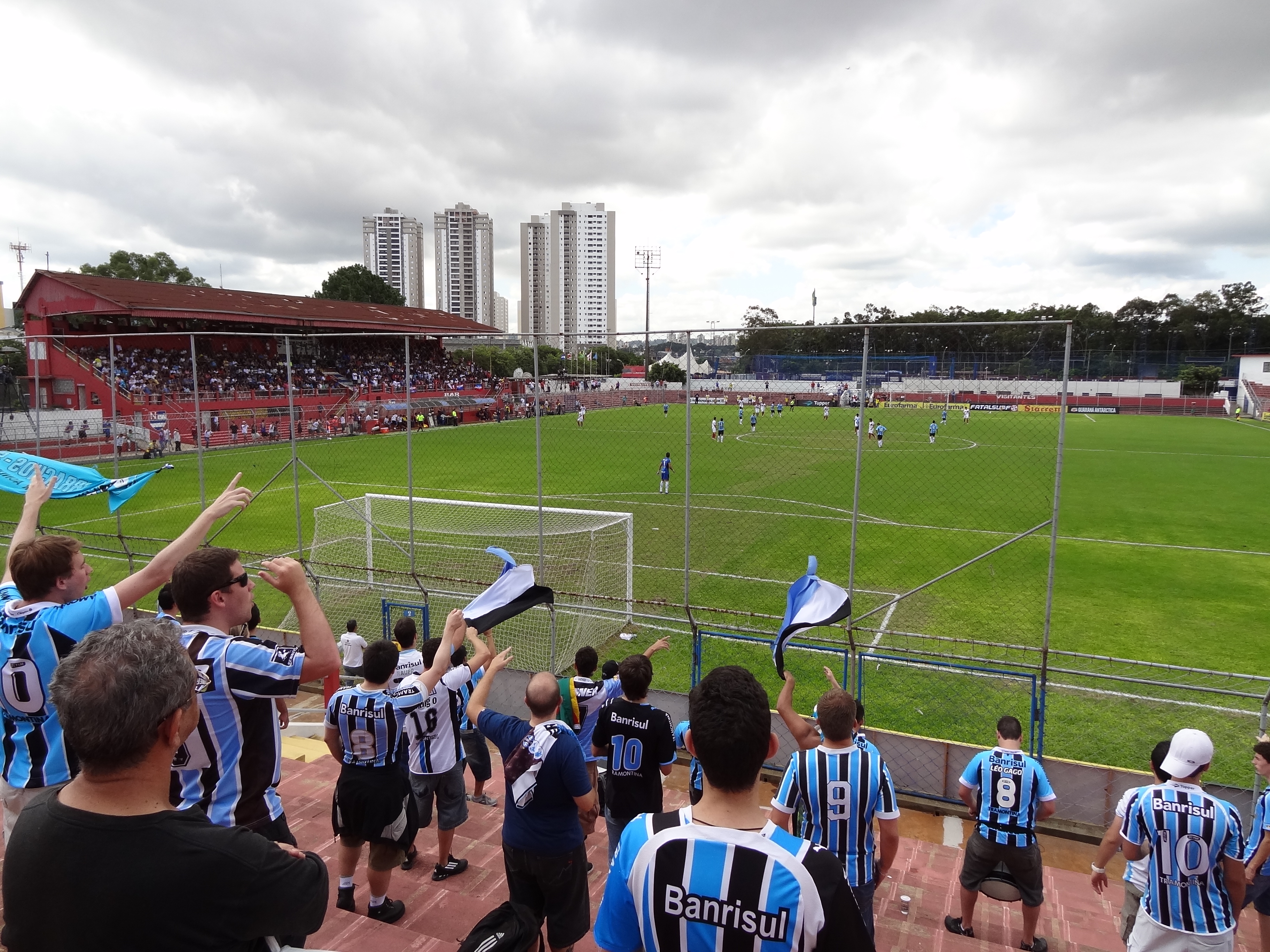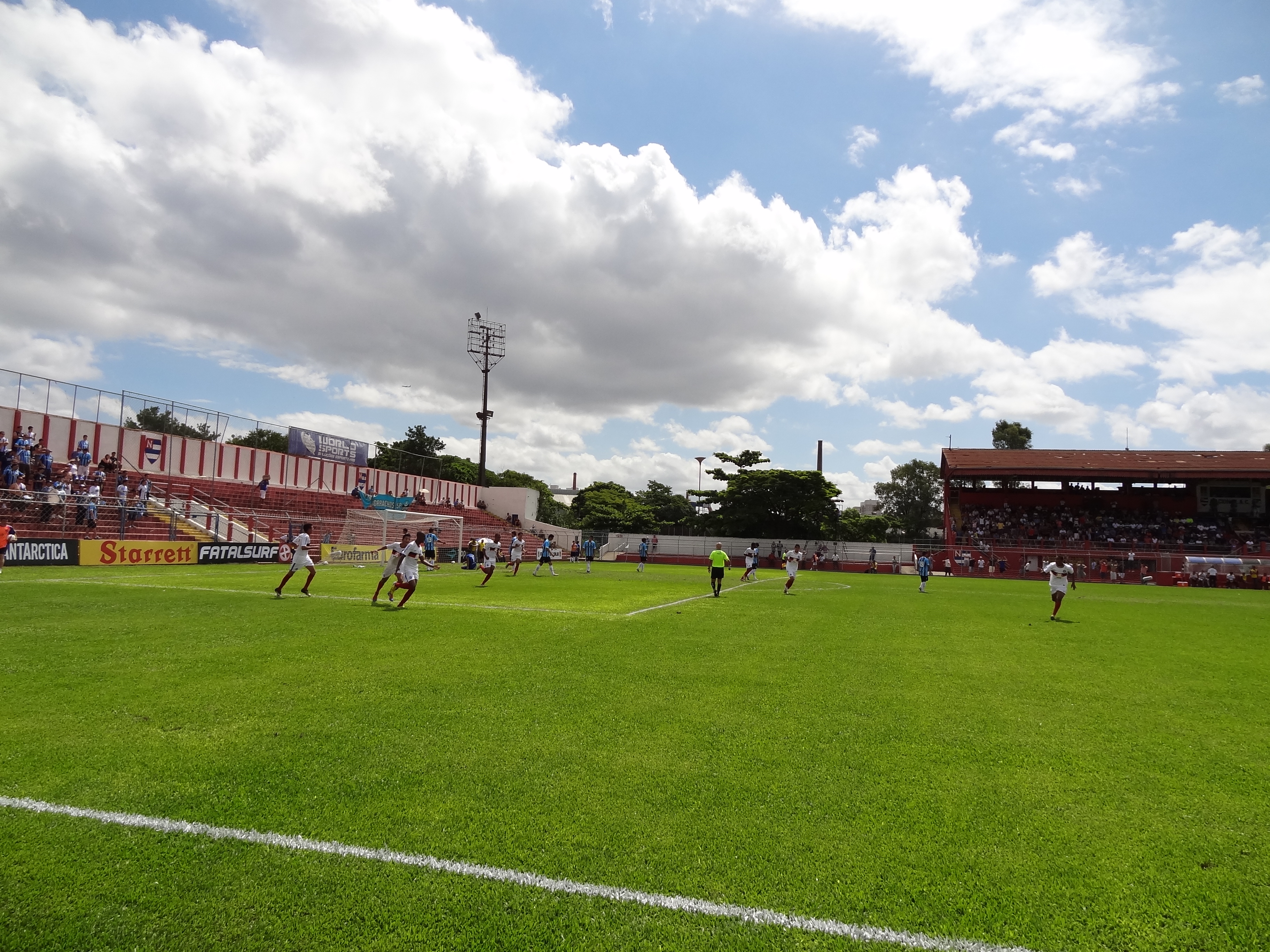 Grêmio e Bahia disputaram uma das quartas da Copa São Paulo de Futebol Júnior, no começo da tarde deste domingo, no estádio do Nacional Atlético Clube, um dos clubes fundadores da Federação Paulista (quando o NAC -ou Naça – ainda se chamava São Paulo Railway). Os torcedores dos dois tricolores deram show e o jogo pela Copinha foi disputado – os tricolores baianos saíram na frente. Os gaúchos empataram, mas acabaram perdendo de goleada. “Mais um Bahia, mais um Bahia”, pede o hino popular. Terminou 4×1 para os júniores do Bahia, semifinalista da Copinha. Porém, o foco principal deste post é o simpático estádio Nicolau Alayon, também conhecido pelo nome da rua próxima, Comendador Sousa. O Nacional é dono do estádio, onde o Audax (leia-se Pão de Açúcar) tem mandado seus jogos. Já há algumas marcas desse compartilhamento: escudo do Audax numa tribuna e no colete de vendedores ambulantes. É neste simpático estádio da rua Comendador Sousa que o Audax vai receber em breve o Juventus e a Portuguesa, em … digamos… clássicos municipais pela segundona paulista (série A2 estadual). O Naça está na quarta divisão do futebol paulista.