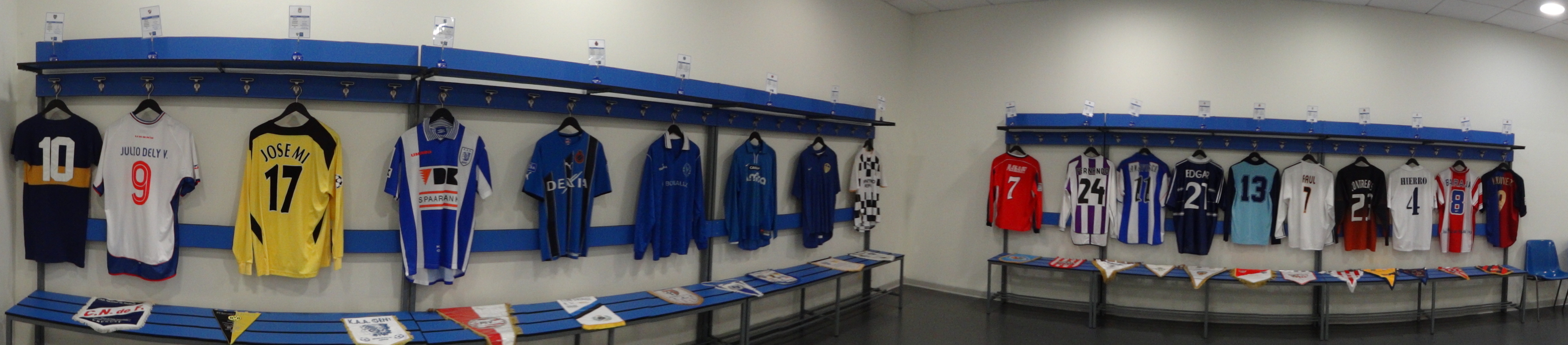 Pelé jogou em La Rosaleda com o Santos, na edição de 1967 do troféu Costa del Sol, torneio de verão organizado pelo Málaga. Em 67, deu Espanyol! O Peixe ficou com o 3º lugar. A tour segue pelo vestiário visitante e aí está uma das coisas mais legais da visita guiada. Flâmulas de times visitantes e camisetas de jogadores que atuaram em La Rosaleda, como Raúl, Hierro, Kluivert, Makaay…