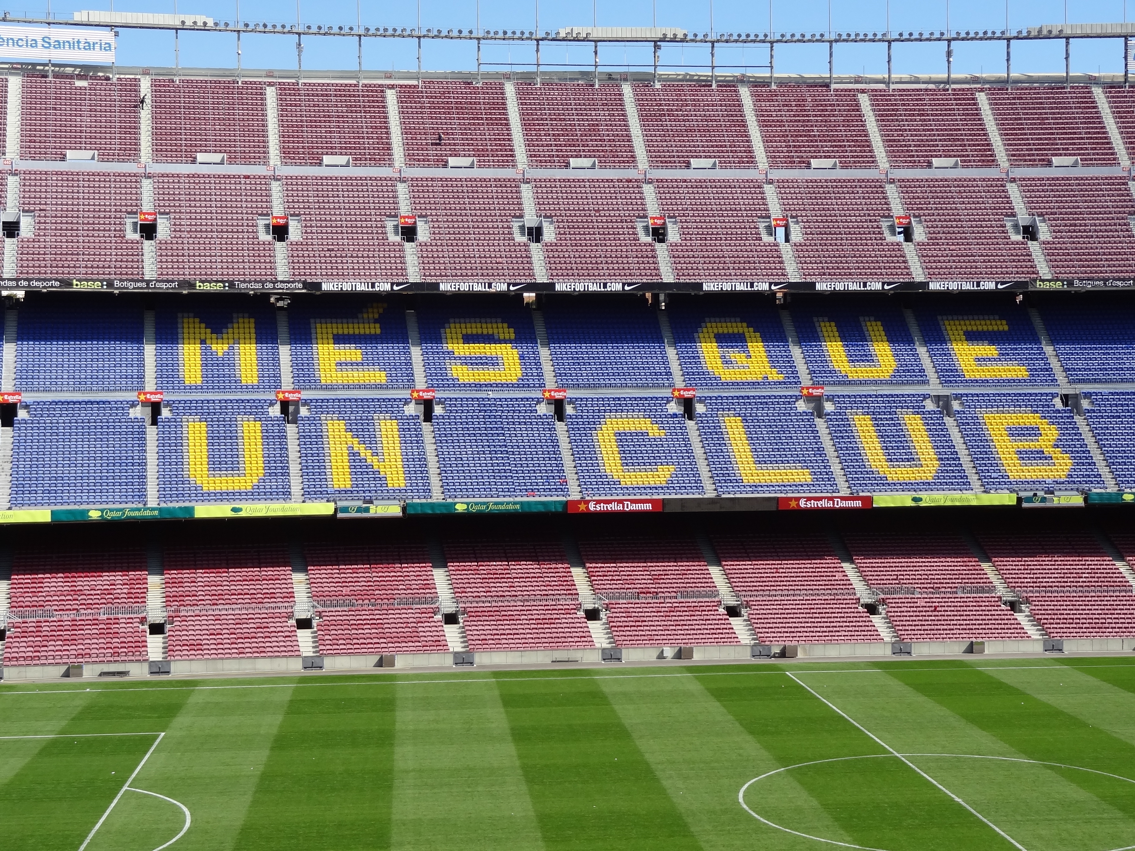 Estas arquibancadas daí de cima devem ser o cenário de mais um gigantesco mosaico nesta temporada do futebol europeu. Depois do sucesso do binóculo da torcida do Borussia, que agora vê Wembley logo ali, em 25 de maio, o Barcelona vai distribuir 90 mil cartazes pra os torcedores culés que forem ao Camp Nou formarem o mosaico: “Barça, orgulho, Barça”.