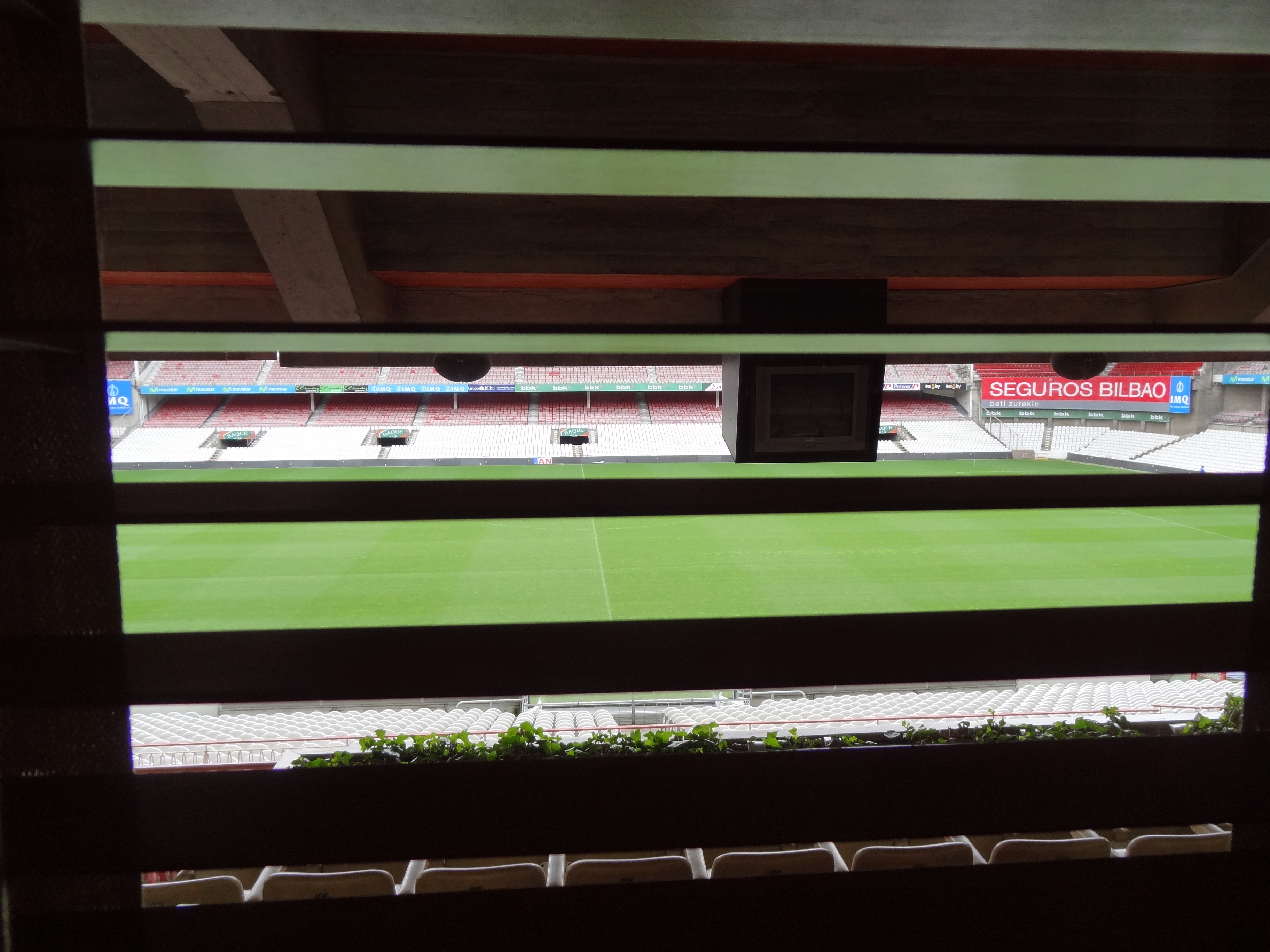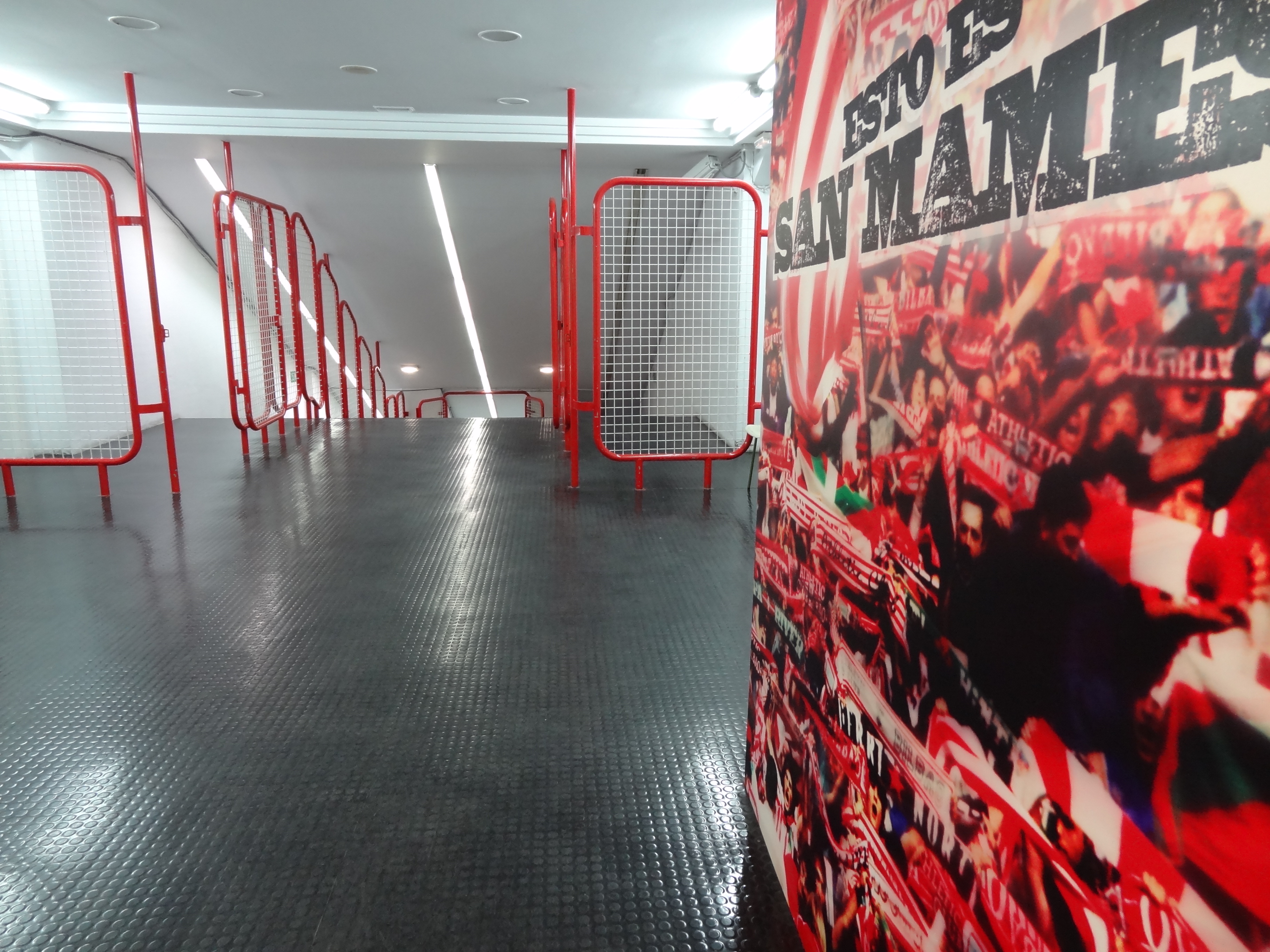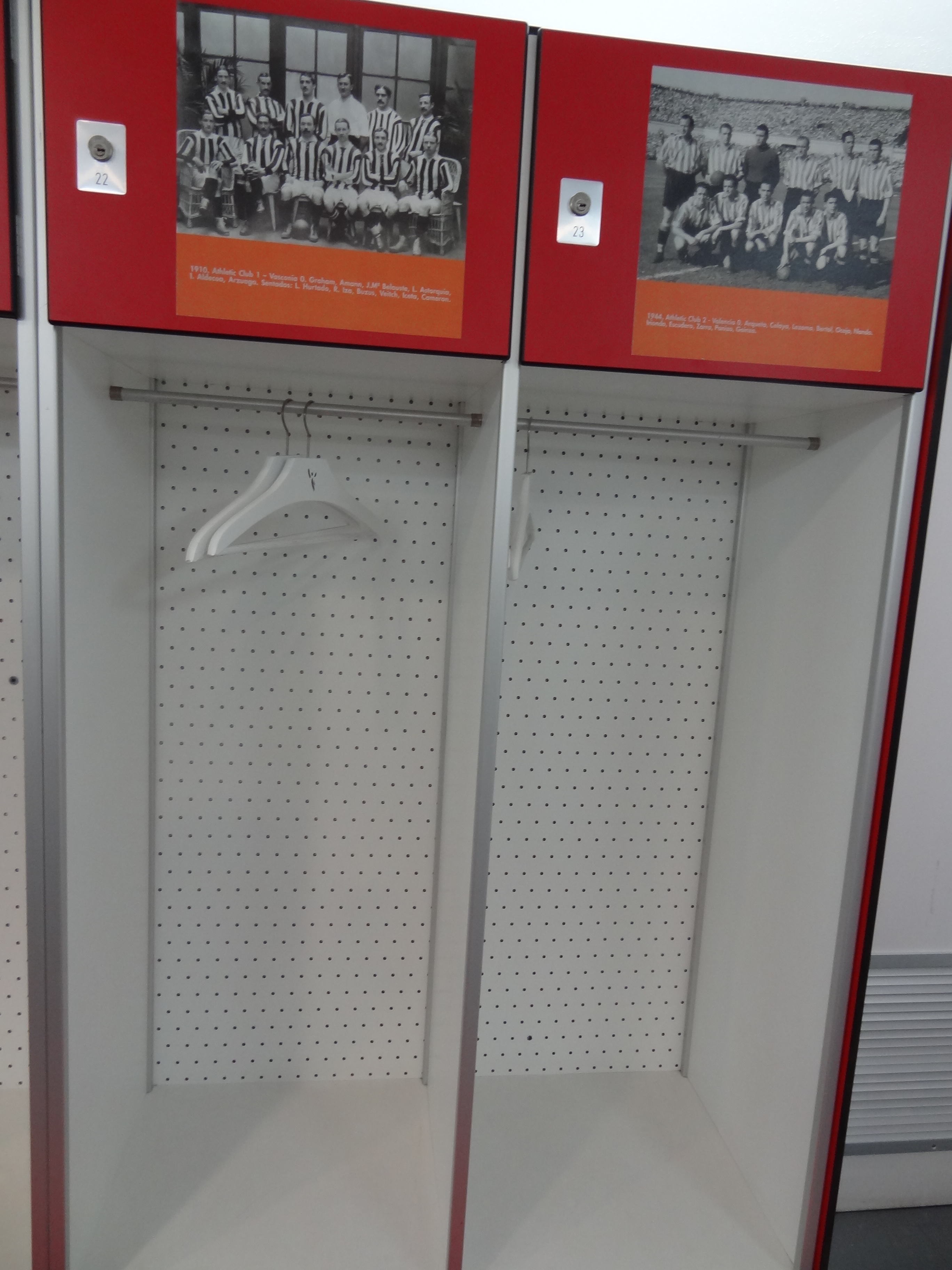 BILBAO – O blog Fut Pop Clube teve a oportunidade e o prazer de conhecer o Museo Athletic Club e fazer uma visita guiada (pela simpática Aida) ao estádio que verá sua última partida neste ano em que completa o centenário. Custa 7 euros para adultos não-sócios. Não é permitido tirar fotos no museu, mas ele tem uma interessante coleção de carteiras de sócios (alguns, por uma vida inteira), ingressos, cartazes/postêres e programas de jogos – como o amistoso de 80 anos do estádio, contra o Flamengo, e do centenário do Athleti, contra a seleção brasileira, pouco antes da Copa de 98. Também há uma camisa do Flamengo, de 1993 (Umbro). Claro, as taças do clube. Uma linha do tempo da história do clube e de San Mamés. Um díptico – um imenso painel – com os jogadores de 1898 a 2013, como se fosse aquela tradiciola pose do elenco para a posteridade. E é.