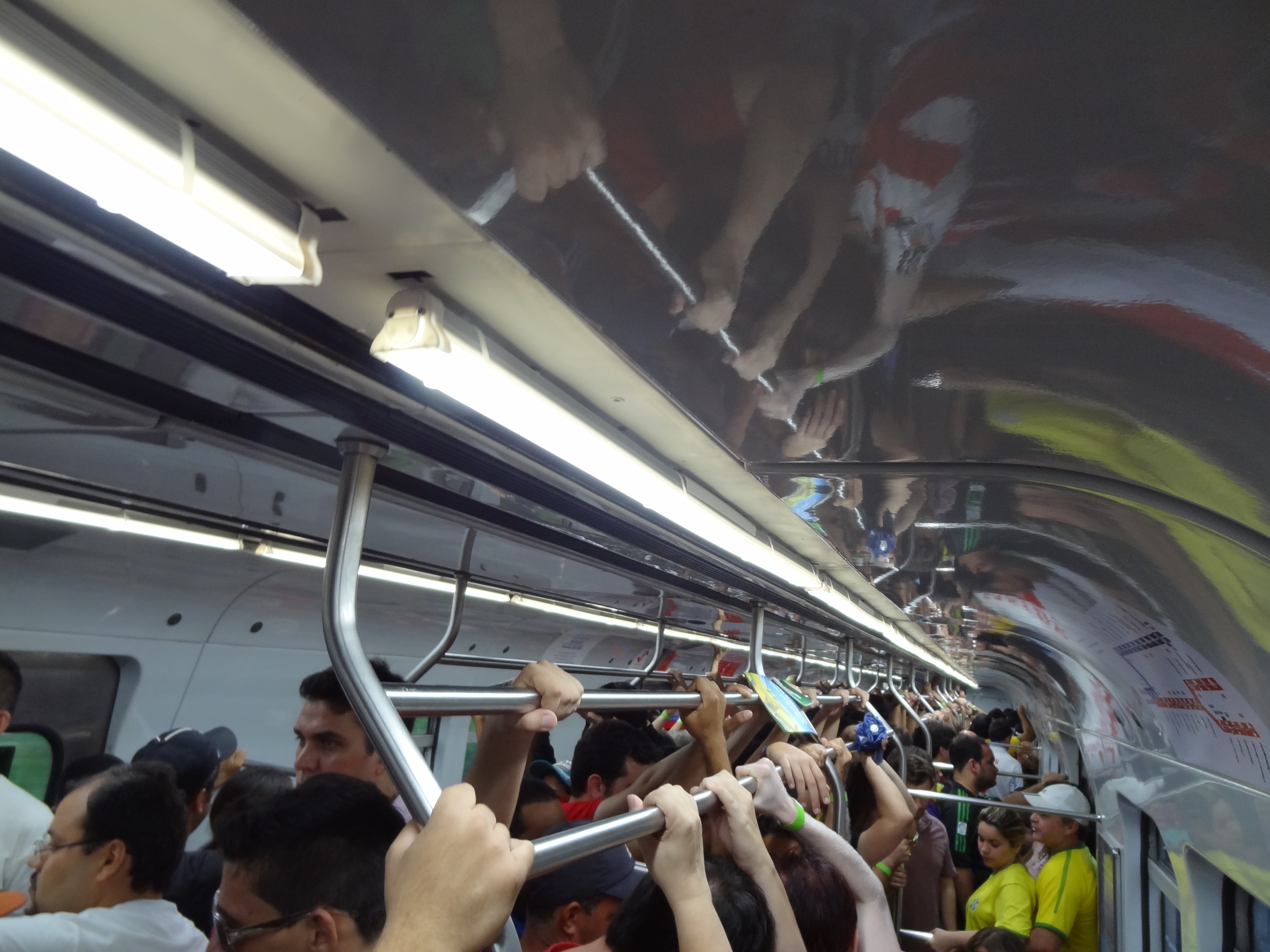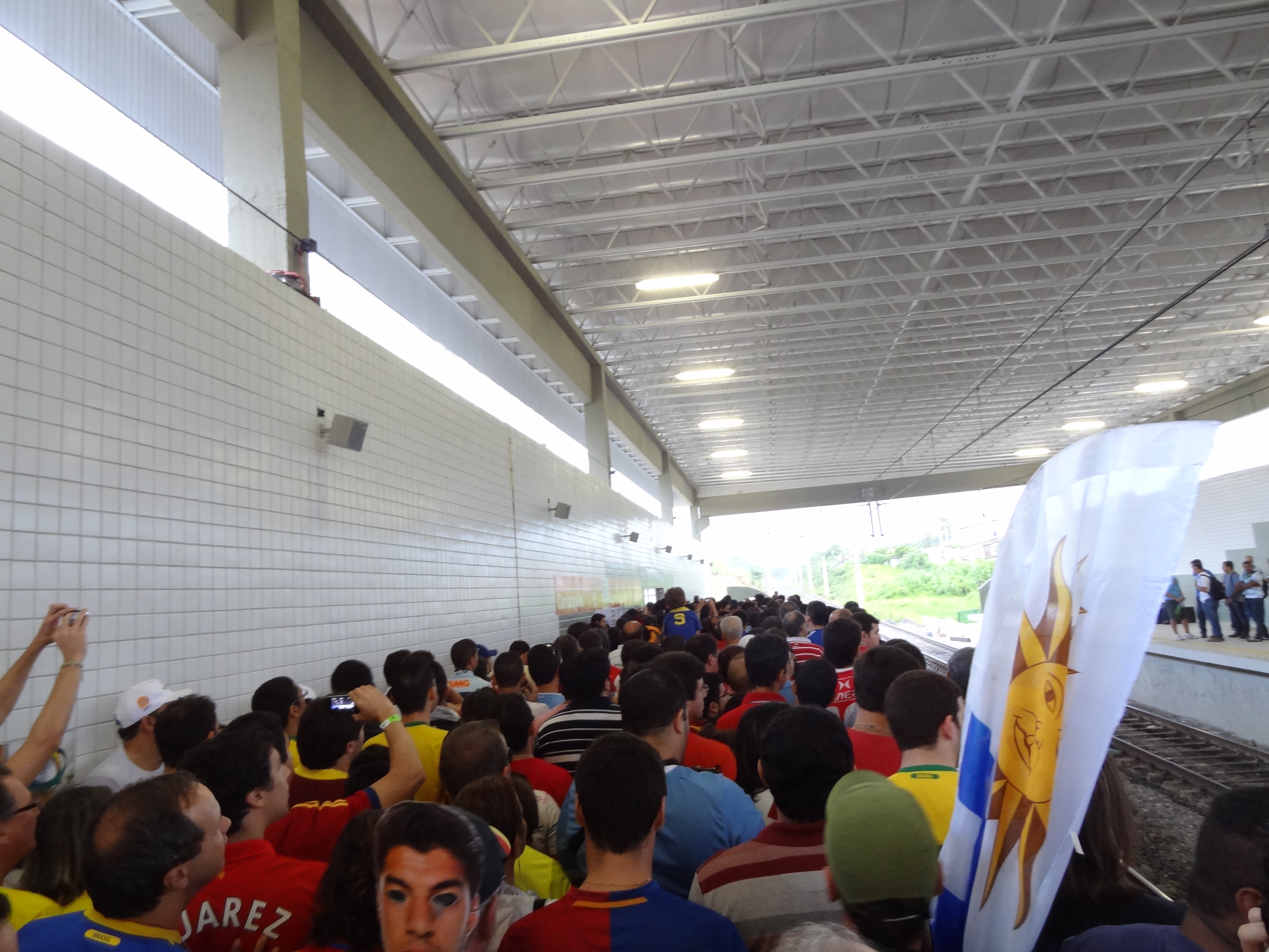 Para evitar uma grande muvuca na saída, em busca de transporte, o jeito foi deixar a Arena Pernambuco minutos antes do fim da partida – ouvi do lado de fora o grito de gol do Uruguai. Mesmo assim, havia já uma grande fila para pegar o ônibus de volta para a estação Cosme e Damião do Metrô. Lá cheguei às 21h28. E daí em diante o trem seguiu normalmente até o centro do Recife. Mas ouvi relatos de quem levou três horas para chegar em casa.