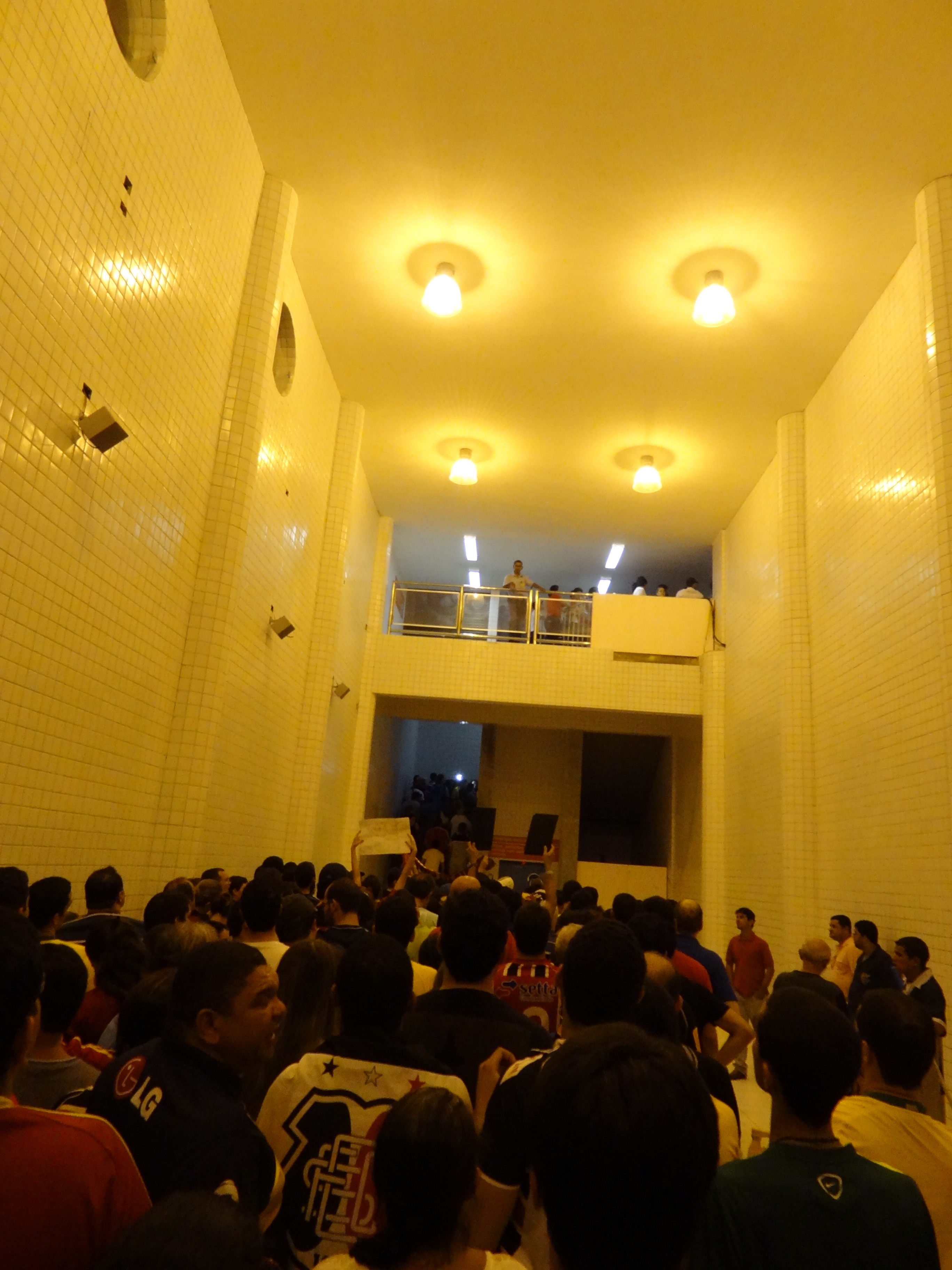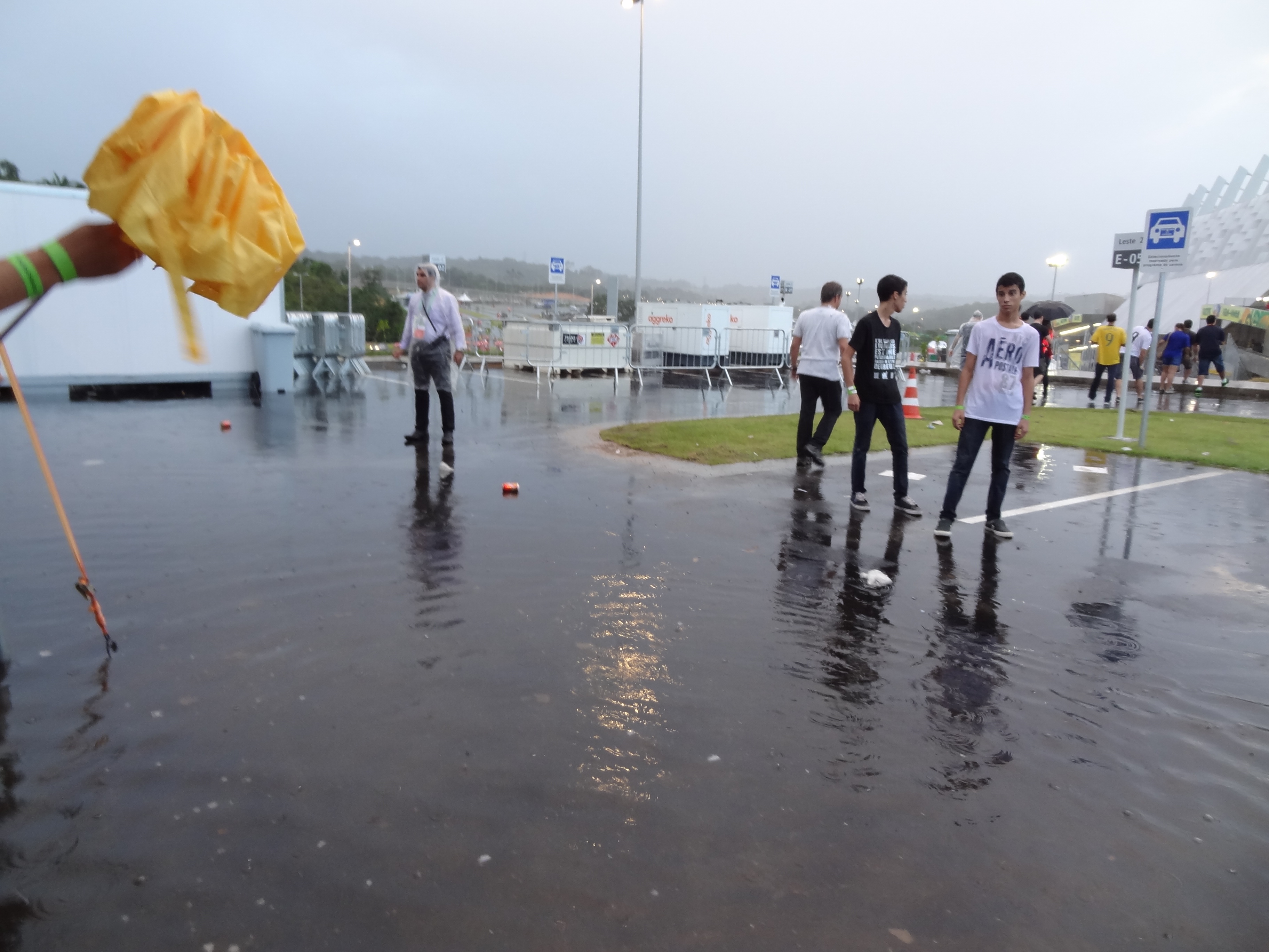 O ônibus para a cerca de um quilômetro da Arena Pernambuco. Caminhada sujeita a chuva (como a que caiu domingo), não tem onde se proteger. Na frente do estádio, há um posto de detector de metais – um espaço apertado. Os funcionários não fazem a mínima questão de ajudar o torcedor a deixar objetos na bandeja, como aquela dos aeroportos. Em volta desse posto, estava tudo alagado. Resultado: tênis encharcado.