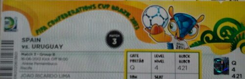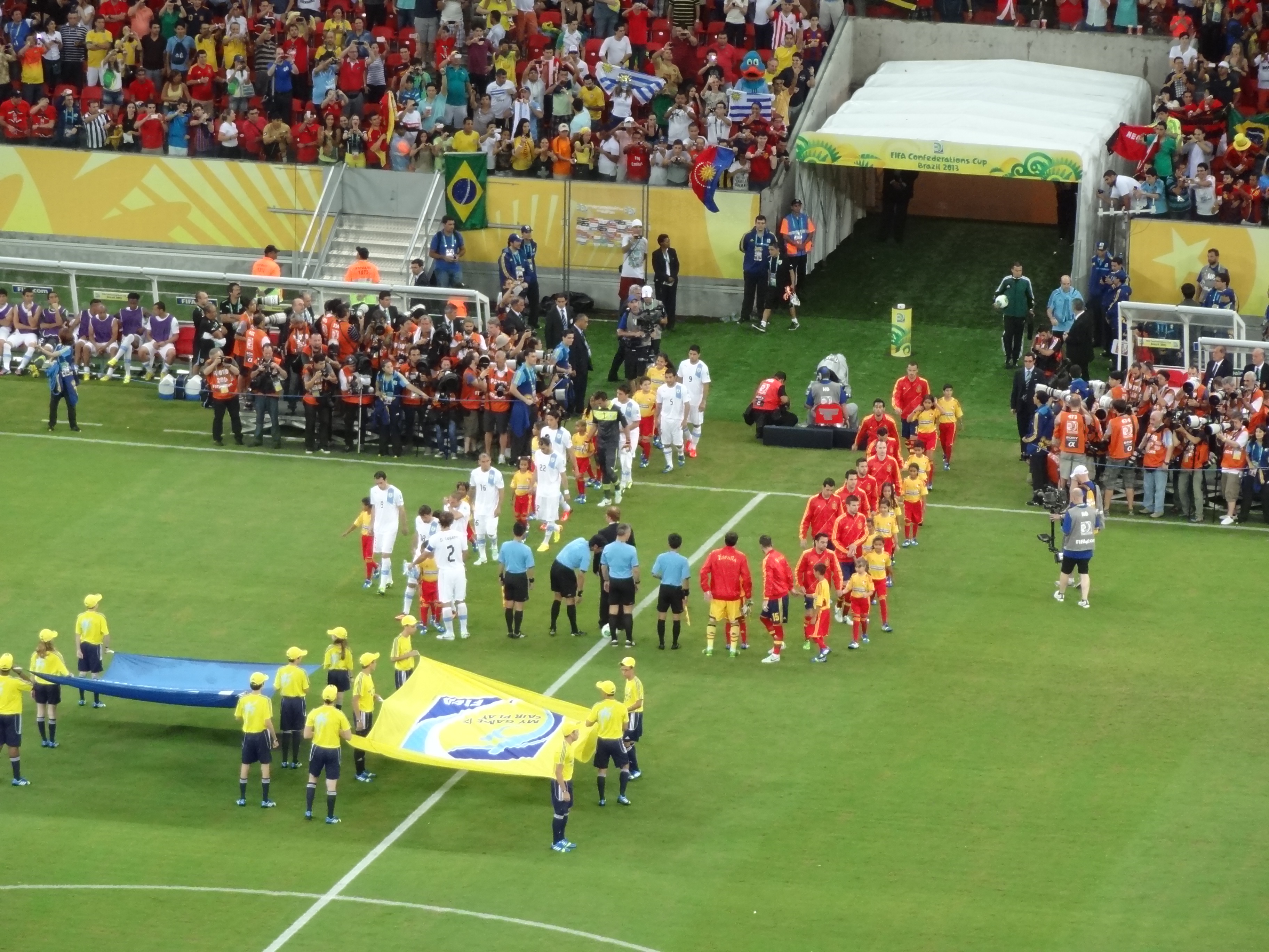 Rolê do Fut Pop Clube pela Arena Pernambuco, um dos estádios da Copa de 2014, em noite de Espanha 2×1 Uruguai, pelo grupo B da Copa das Confederações 2013. Mas também poderia chamar de perrengue. Perrengue para chegar ao estádio, mesmo saindo com quatro horas de antecedência de Boa Viagem, o bairro onde estão os hotéis no Recife. E aí é que mora o primeiro problema: a Arena Pernambuco foi construída em outro município, São Lourenço da Mata. Pra chegar lá, de transporte público, tem que fazer algumas baldeações e enfrentar superlotações em trens, plataformas e ônibus, que fazem o “shuttle” entre o estádio (oops, arena) e a estação de Metrô mais próxima (Cosme e Damião). No shopping Recife, saída 3, perto do Parque das Esculturas, com o ingresso na mão, tive direito a pegar de graça um ônibus até o Metrô. Até aí tudo bem, era um ônibus atrás do outro e o trajeto até a estação Joana Bezerra foi curto. Na estação Joana Bezerra, tomei o Metrô até a estação Recife, de onde partem os trens para a região da Arena Pernambuco.