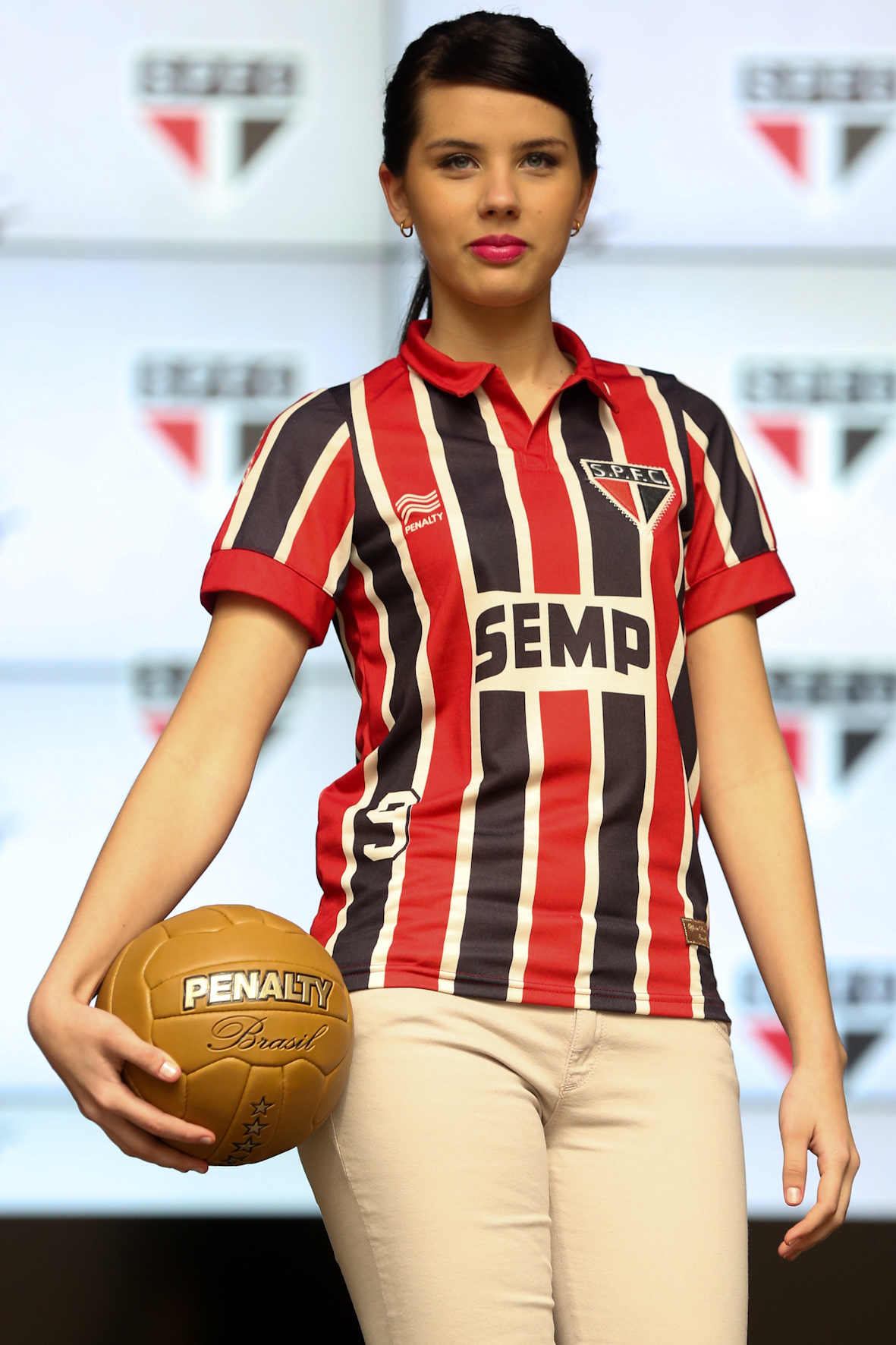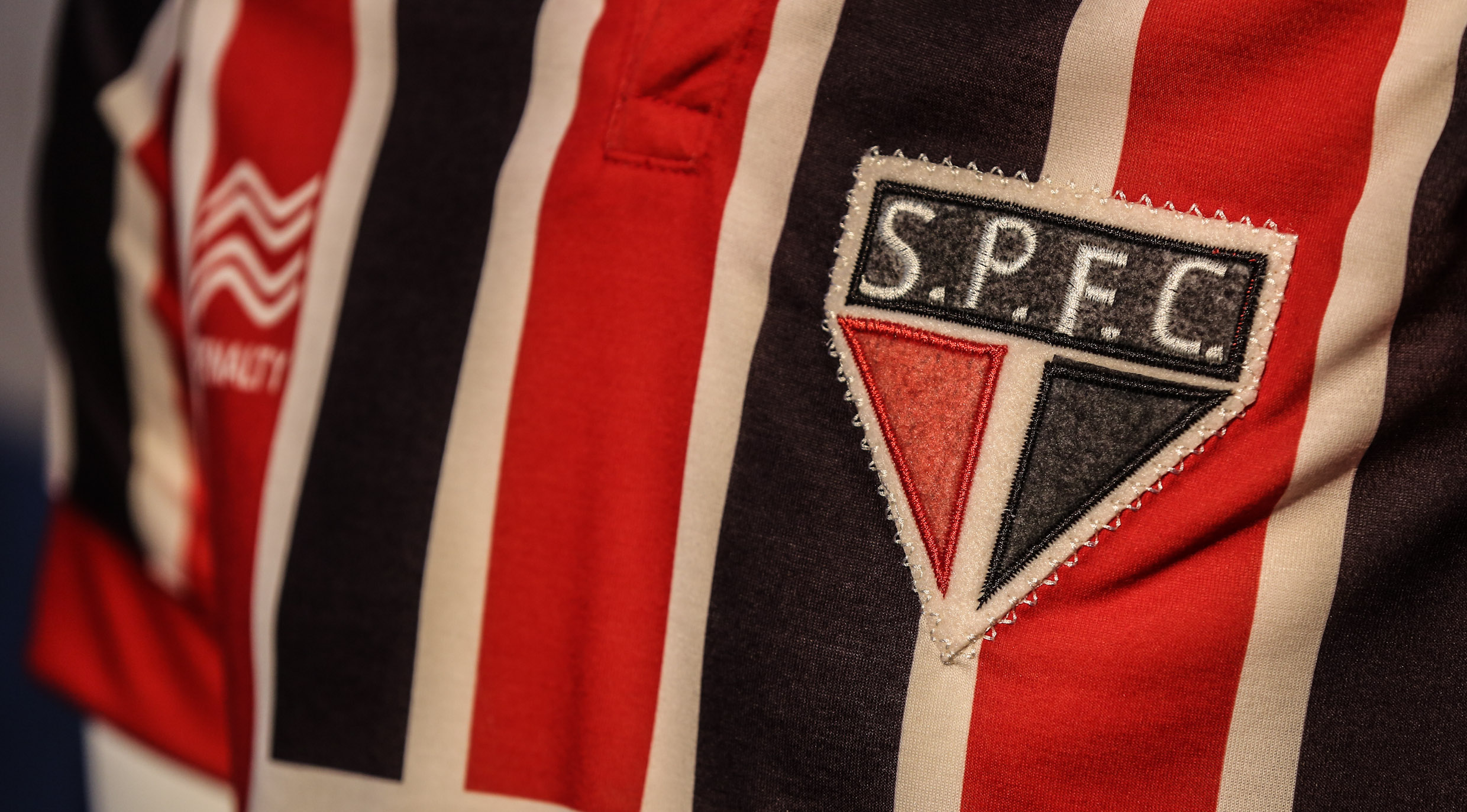 Depois da horrorosa camisa “vermelha” que chegou a ser usada como uniforme 3 do tricolor nas quartas de final do Paulistão 2013, a Penalty acertou com a linha retrô do São Paulo em homenagem aos 100 anos do nascimento do homem-borracha, Leônidas da Silva. A viúva do artilheiro, Albertina Santos, participou da homenagem. Bacana demais. São três uniformes relativos aos quase 10 anos em que Leônidas foi o homem-gol são-paulino, entre 1942 e 1950 (ganhou 5 títulos paulistas: 43, 44, 46, 47, 49. O uniforme 1, o 2 e um de goleiro (esse, meio feioso). Todos têm gola polo, distintivo vintage (iniciais S.P.F.C. com pontos), costurado, e as marcas dos atuais patrocinadores também ganham jeito retrô. Lógico que em 1942 não havia logomarcas de patrocinadores nos uniformes, mas vale a brincadeira (se tivesse patrocínio nos anos 40, possivelmente poderia ser o chocolate Diamante Negro ou outro produto anunciado por Leônidas, que era bom garoto-propaganda – o primeiro craque midiático brasileiro, como mostra o livro O Diamante Negro – Biografia de Leônidas da Silva, de André Ribeiro). As camisas da Coleção Raízes do “S.P.F.C” já estão nas lojas. Confira os detalhes.