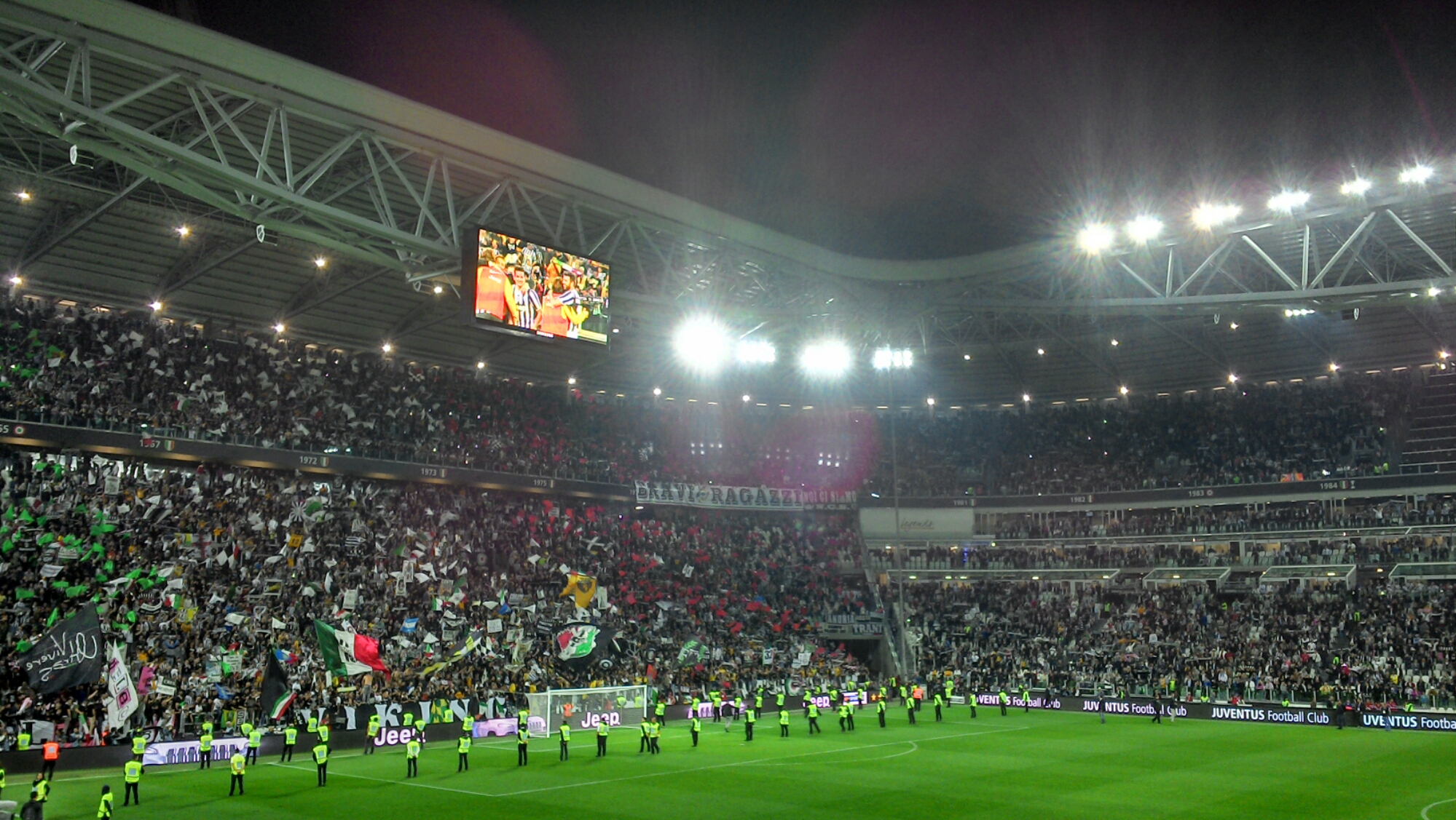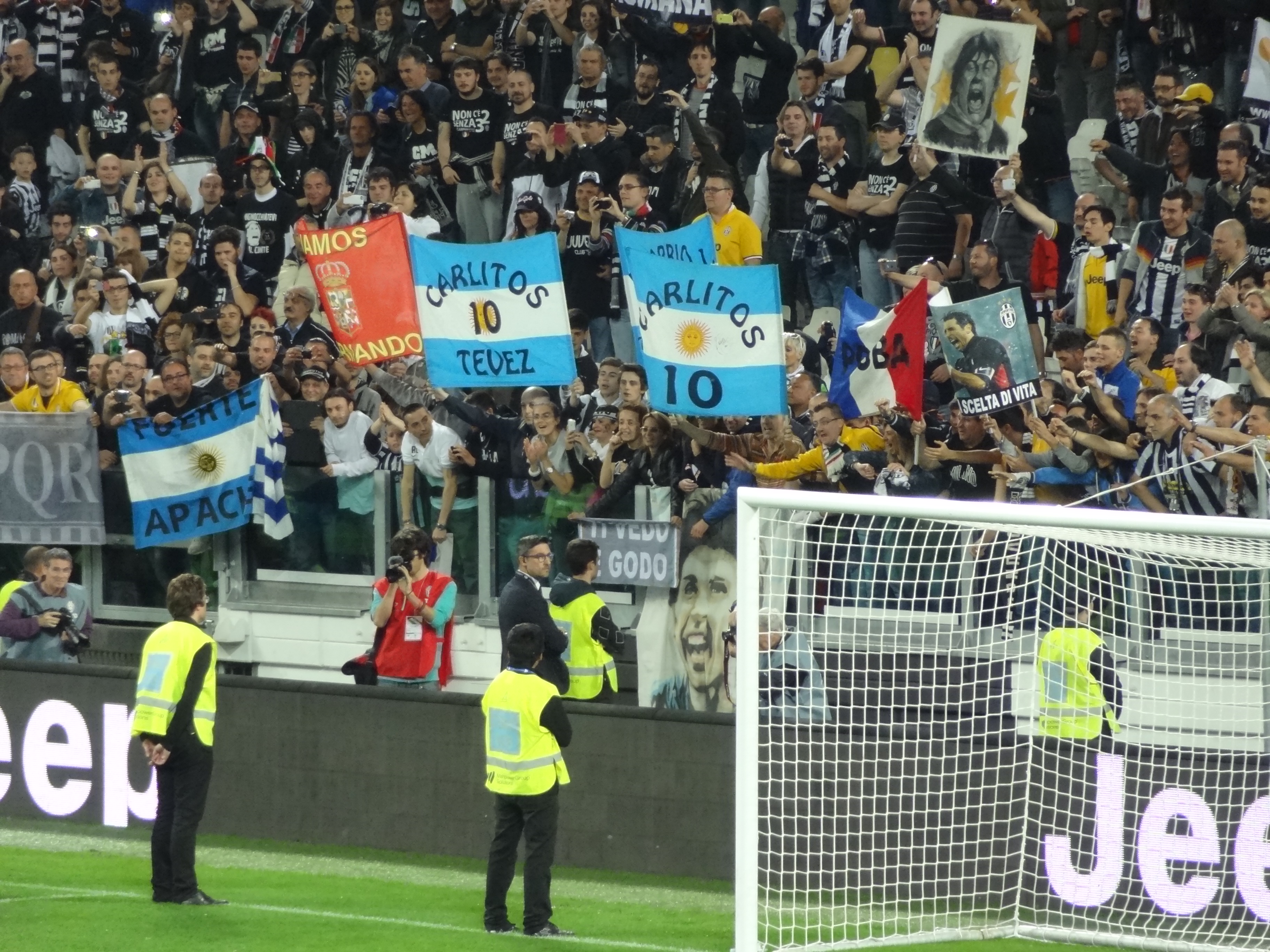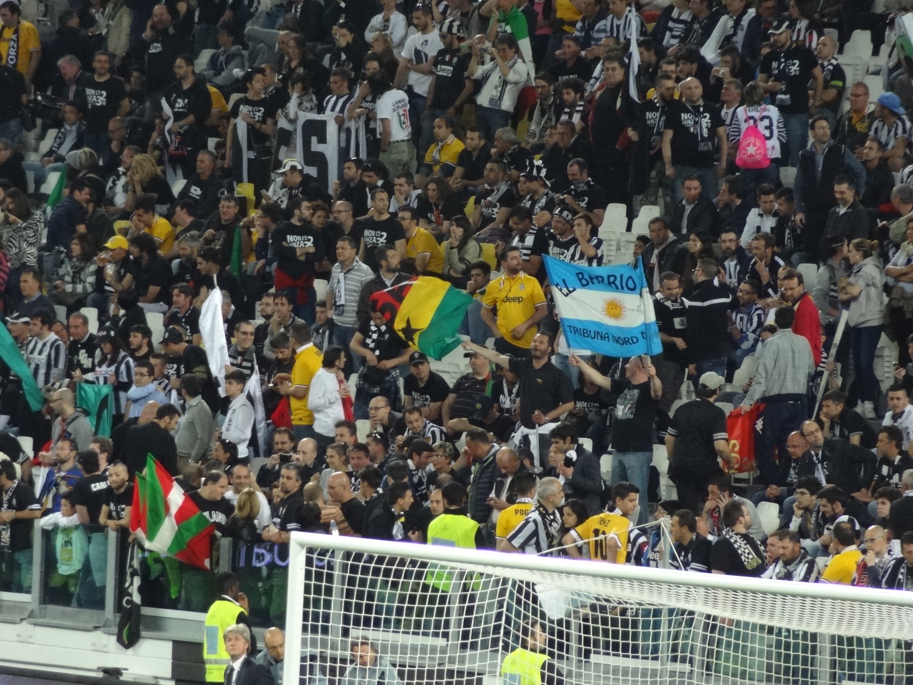 Atrás de um dos gols, muitas bandeiras da Argentina, por causa de Tévez e também reverências ao ganẽs Asamoah e ao basco Llorente.