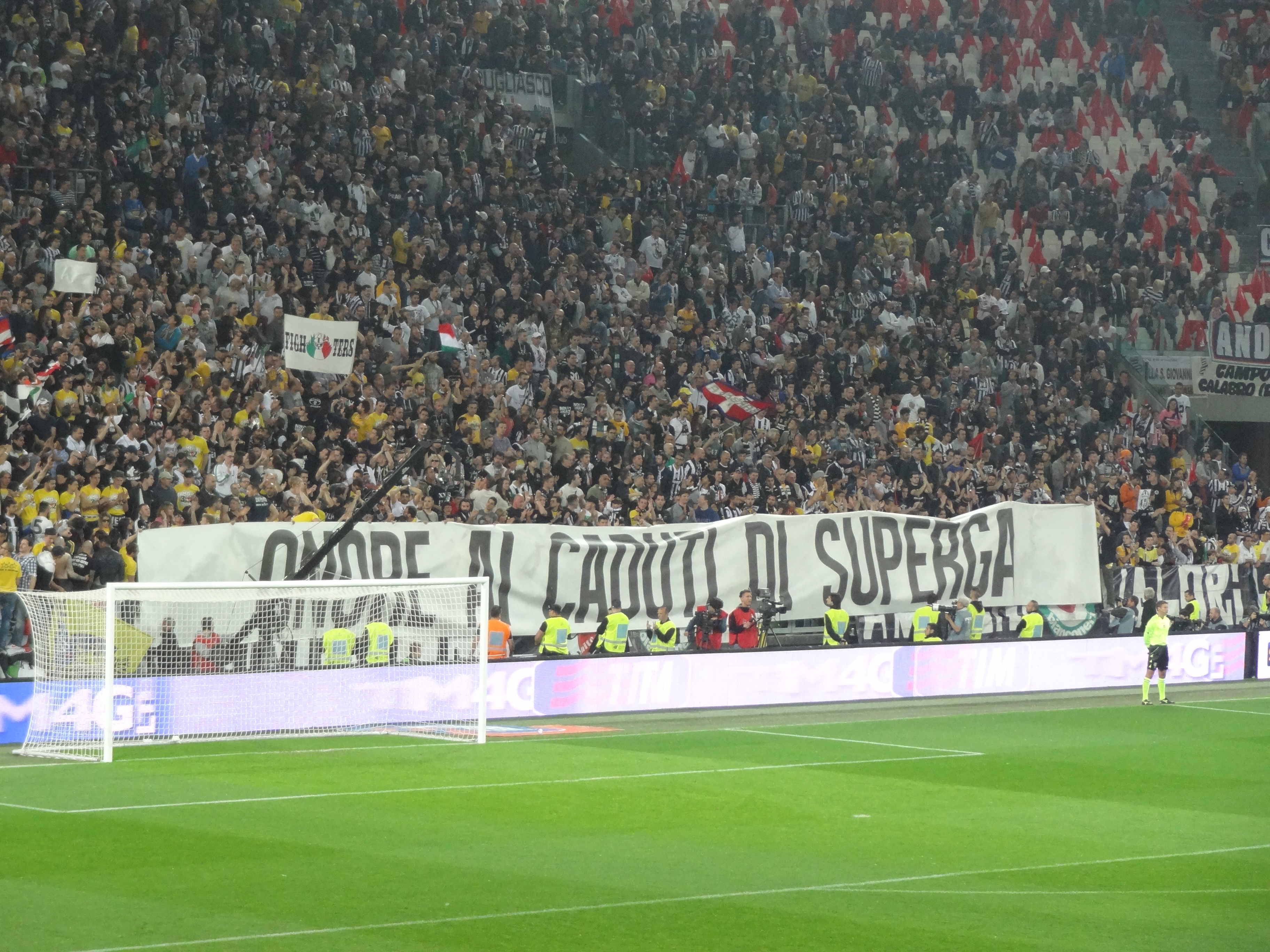 A Curva Sul – onde ficam os ultras – prestou homenagem às vítimas do acidente aéreo que matou um time inteiro do Torino, rival municipal, há 65 anos – a tragédia da basílica de Superga, em maio de 1949.