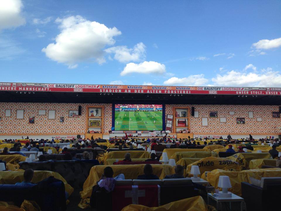 Imagine ver os jogos da Copa com uma galera, confortavelmente, num sofá… no meio do gramado. O estádio do FC Union Berlin virou sala de estar, durante o Mundial. Os jogos da Alemanha e também de outras seleções estão sendo transmitidos num telão no campo do Union Berlin, que disputa a 2. Bundeslida, a segunda divisão do futebol alemão.