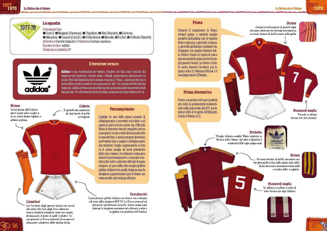 Cada temporada desde 1927 ganha pelo menos uma página com ilustrações, fotos e detalhes dos uniformes. Os scudettos… as mudanças de distintivo e de patrocinadores… a tipologia dos números… E ainda tem o time-base de cada temporada. Veja três exemplos abaixo.