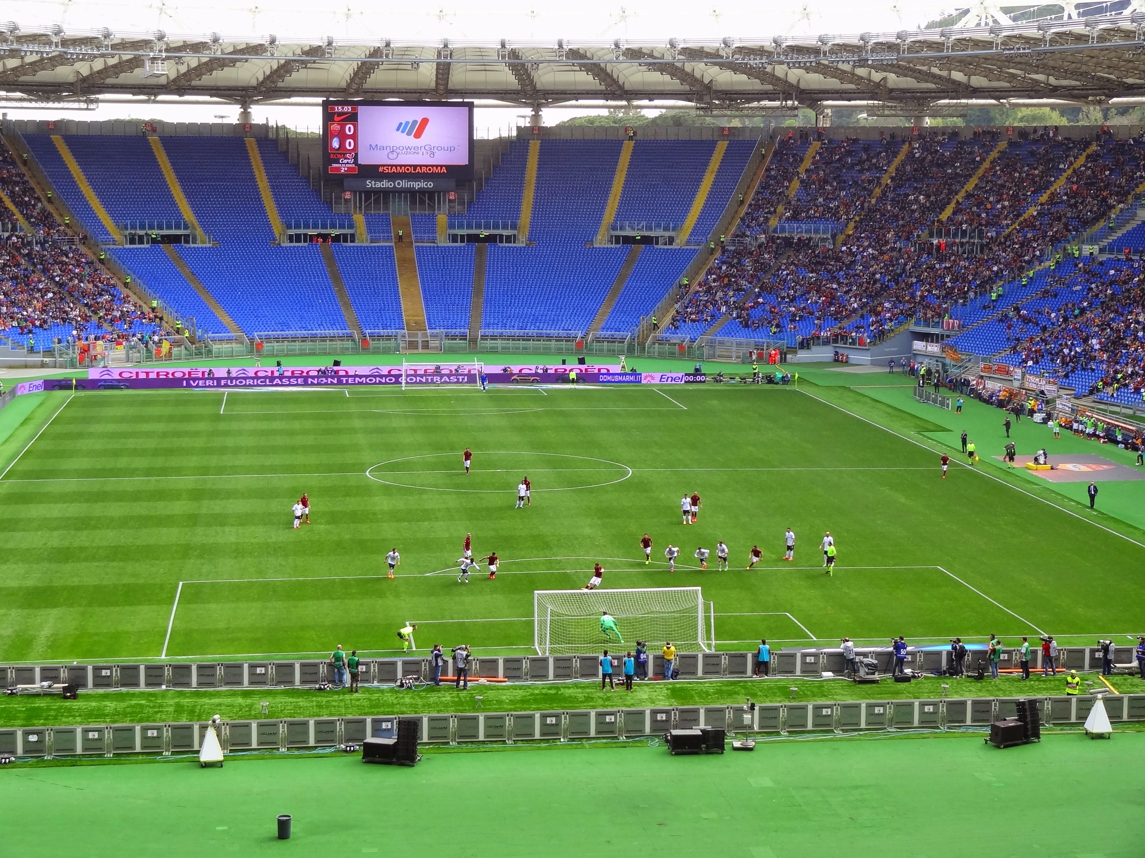 Visitei o Olímpico num domingo de Roma x Atalanta que ficou bem abaixo dessa média de público dos giallorossi. Isso porque a curva sul estava fechada, como dá pra ver na foto abaixo: ninguém na arquibancada atrás do gol do Atalanta no primeiro tempo.