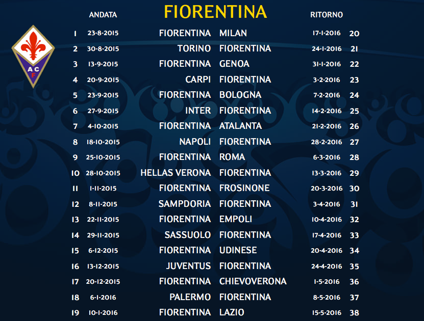 A Fiorentina, fundada em 29 de agosto de 1926, comemora 89 anos neste sábado. A Viola estreou bem na Serie A 2015-16, com uma vitória sobre o Milan. No domingo, visita o Torino (calendário lá embaixo, no fim do post). Na Liga Europa, caiu no grupo I, com os suíços do Basel, os poloneses do Lech e os portugueses dos Belenenses.