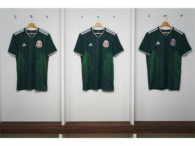 Também inspirado em visuais dos anos 90, o uniforme do México é verde, com um gráfico da cintura ao peito. Nas costas, a inscrição “Soy México”.