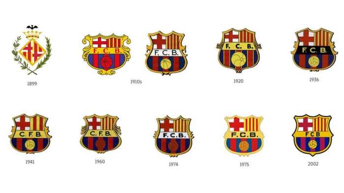 Dentro do post, a evolução do escudo do Barça, de 1899 até o que é usado desde 2002.