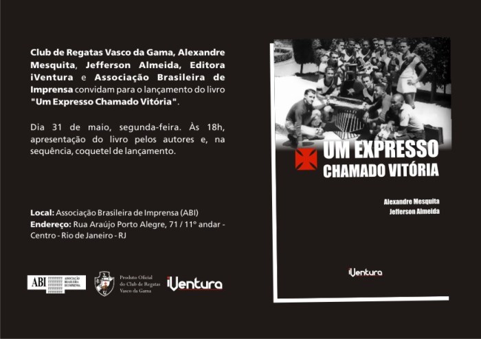 O Expresso da Vitória, timaço do Vasco nos anos 40, é tema de novo livro. “Um Expresso Chamado Vitória” tem lançamento daqui a pouco, às 18h, na sede da ABI (Associação Brasileira de Imprensa), no Rio. Os autores são Alexandre Mesquita e Jefferson Almeida (que é fonte – um dos entrevistados – do filme “Um Artilheiro no Meu Coração“, sobre Ademir Menezes, o goleador daquele time). Aquele Vascão tinha ainda nomes como Barbosa, Rafagnelli, Danilo, Ipojucan, Heleno, Jair Rosa Pinto, Friaça e Tesourinha. Em 1948, trouxe do Chile a taça do Sul-Americano de Clubes Campeões, a primeira conquista do futebol profissional brasileiro fora do país. Editora: i-Ventura.
