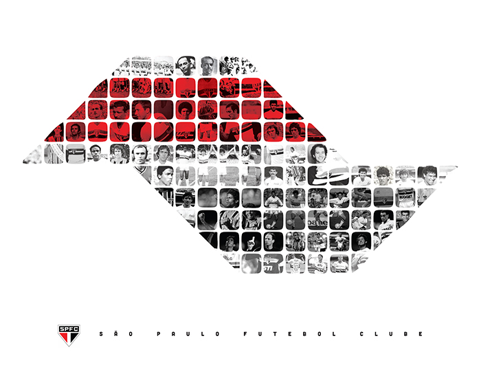 Poster em homenagem ao São Paulo Futebol Clube,  num belo trabalho do designer James Campbell Taylor, da Pennarello Design. Imagens de ídolos da história do tricolor, desde o São Paulo da Floresta, fundado em 25 de janeiro de 1930, formam o mapa estilizado do estado de São Paulo (comum nas calçadas da capital).