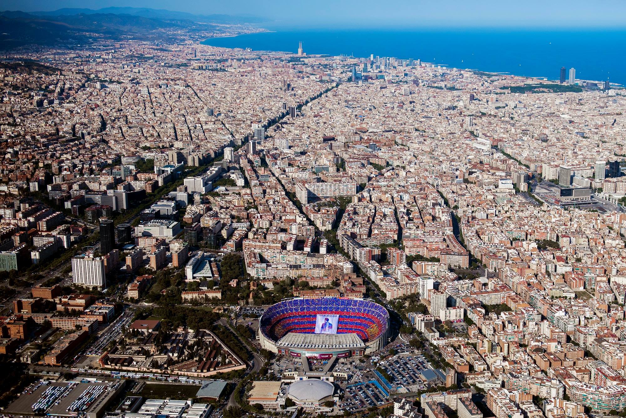E que demais esta foto aérea de Barcelona, mostrando o Camp Nou em Barça 2×2 Dépor La Coruña, o jogo do #6raciesXavi: olha o mosaico e o bandeirão em homenagem ao capitão que se vai.